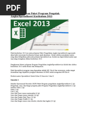 Jul 23, 2014 · pada kurikulum 2013 ini mata pelajaran paket pengolahan angka (spreadsheet) juga masih akan hadir menemani keseharian belajar anak akuntansi. Spreadsheet (lembar sebar) adalah software (program) untuk menangani (mengolah) data dalam bentuk baris dan kolom. Berikut ini adalah ki dan kd mata pelajaran program paket pengolah angka / spreadsheet yang sesuai dengan kurikulum 2013. Download buku siswa pjok kelas 9 kurikulum 2013 re. Harga buku paket smp kurikulum 2013;