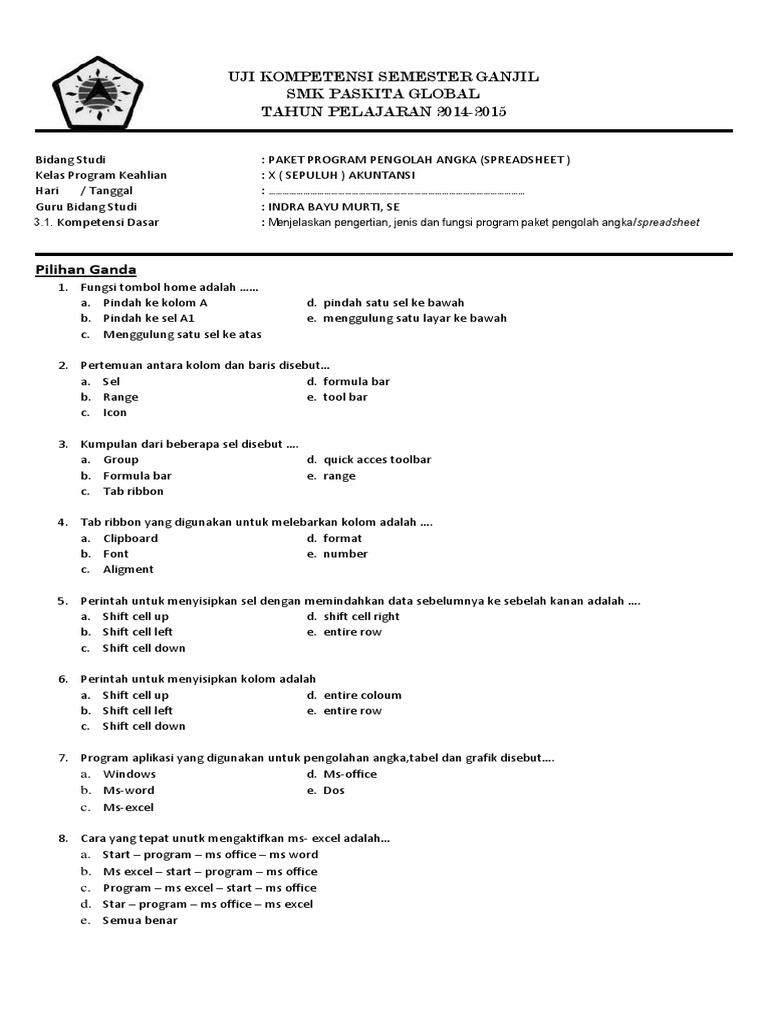 3.8 60 soal pengantar ekonomi bisnis kelas x akuntansi dan kunci jawaban … contoh soal akuntansi kelas x semester 1 Dec 23, 2019 · aplikasi pengolah angka spreadsheet smk mak kelompok c2 kelas x. Jul 23, 2014 · pada kurikulum 2013 ini mata pelajaran paket pengolahan angka (spreadsheet) juga masih akan hadir menemani keseharian belajar anak akuntansi. Untuk sekilas memahami materi yang akan didapatkan pada mata pelajara spreadsheet ini, berikut ini dapat dilihat materi apa saja yang terangkum dalam kurikulum 2013. Spreadsheet (lembar sebar) adalah software (program) untuk menangani (mengolah) data dalam bentuk baris dan kolom.